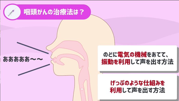 ただし下の方にできた咽頭がんや、喉頭がんがある程度進行した状態で進行した場合は、喉頭の全摘出を余儀なくされてしまい、声を失ってしまう場合もあります。