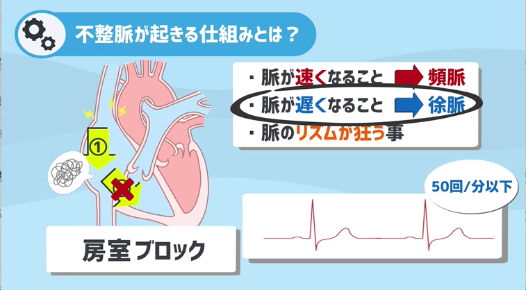 この状態を心房の房と心室の室をとって房室ブロックと呼び、このせいで思うように電気の信号が送れないがために脈が遅くなる徐脈、の状態になってしまう事もあるんです。