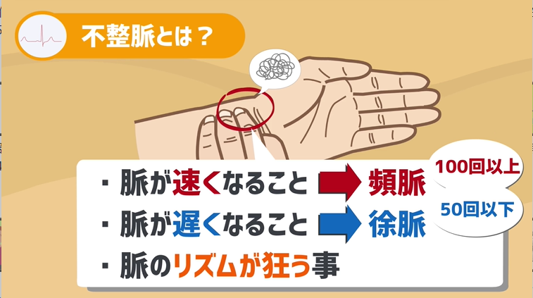 脈をはかるのは慣れない作業だと思いますが、明らかにリズムがおかしい、明らかに早い場合は自分の脈を触れる事で気づく場合もなくはないです。
