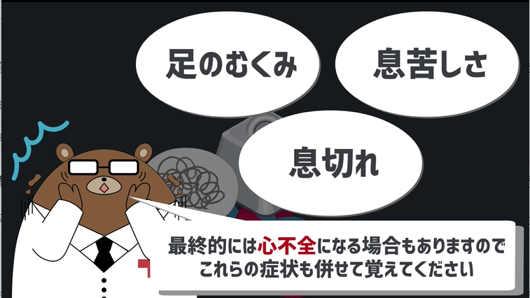 そして不整脈を放置しておくと心臓に負担がかかってしまうので、最終的には心不全の状態になり足のむくみ、息切れ、息苦しさといった症状が出現する場合もあるのでそちらも併せて覚えておいて下さい。