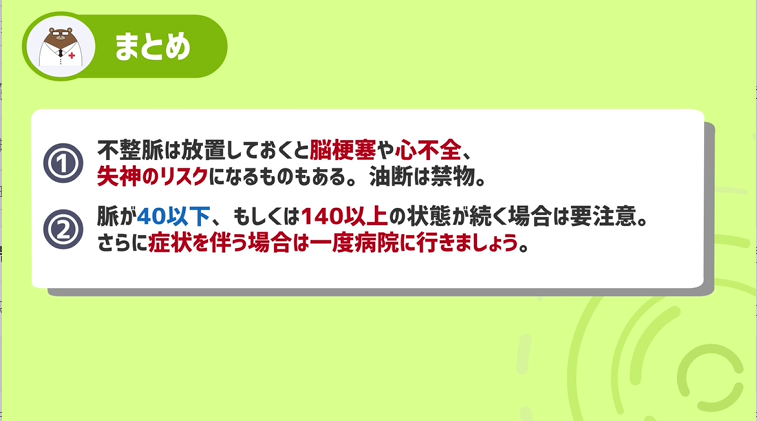 ①不整脈は放置しておくと脳梗塞や心不全、失神のリスクになるものもある。油断は禁物。
