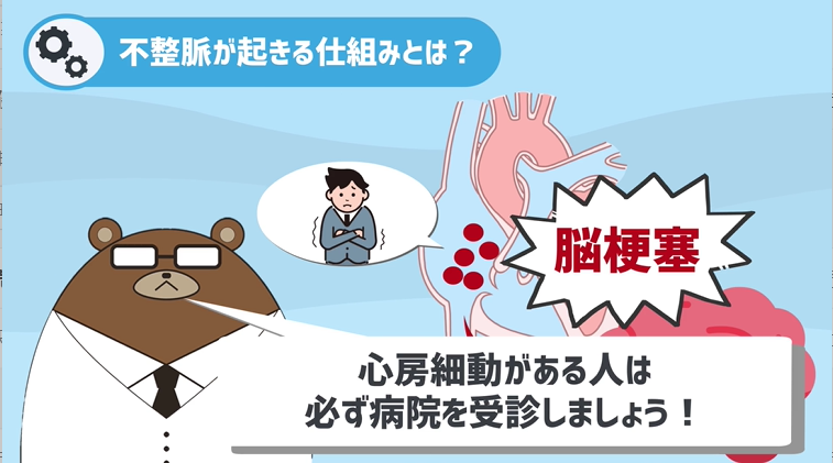 不整脈に関しては、例えば心房細動がある場合は心房がずっとふるえている状態で、心房で血が固まりやすくなってしまい、最終的に血栓ができてそれが脳に飛ぶと脳梗塞になってしまう場合があります。