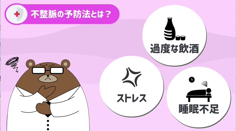 正直言って、不整脈は年をとるごとに起きやすくなるものですし、過度なストレスや睡眠不足、飲酒などが影響するとは言われていますが、いわゆる予防といっても一般的な規則正しい生活するのが良い、くらいの事しか言えないでしょう。