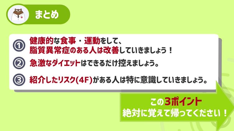 ・健康的な食事・運動をして、脂質異常症のある人は改善していきましょう!