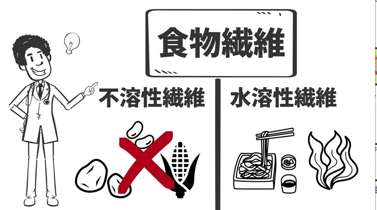 おススメは水に溶けやすい繊維のはいった食べ物で、例えばそばやわかめなんかですね。