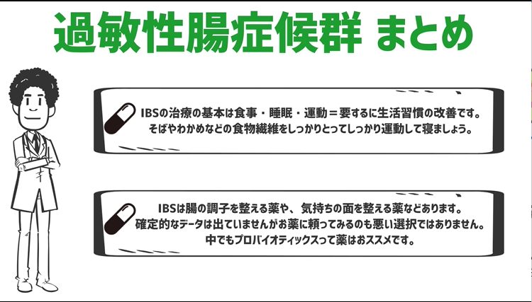 ・IBSの治療の基本は食事・睡眠・運動=要するに生活習慣の改善です。そばやわかめなどの食物繊維をしっかりとってしっかり運動して寝ましょう。