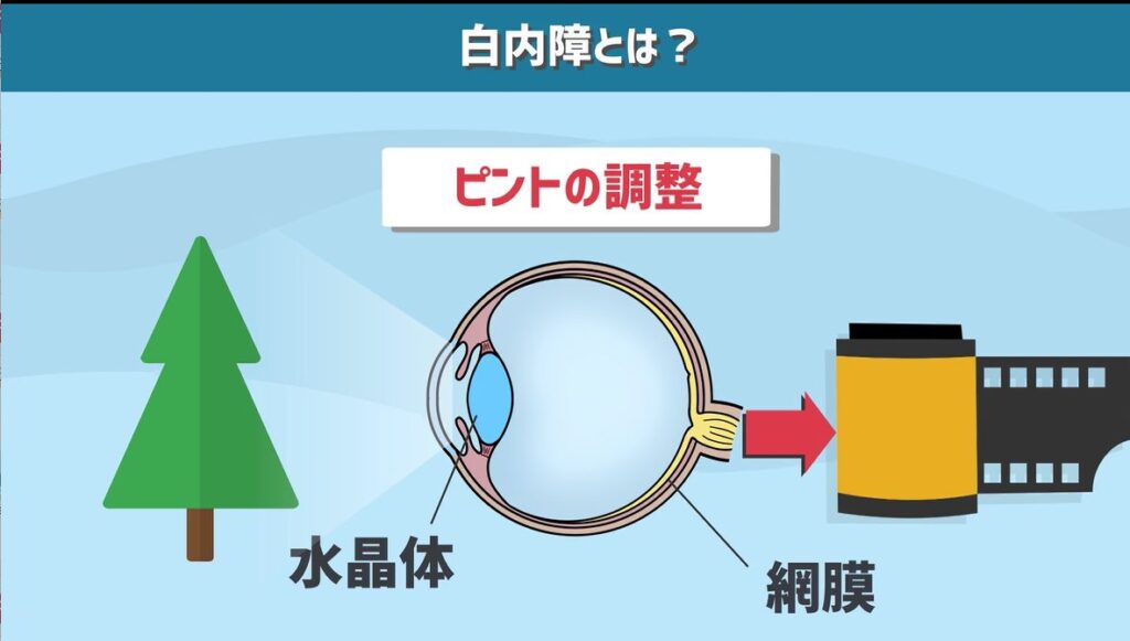 このように、レンズである水晶体部分が濁って、固くなってしまう病気、これが「白内障」なんですね。