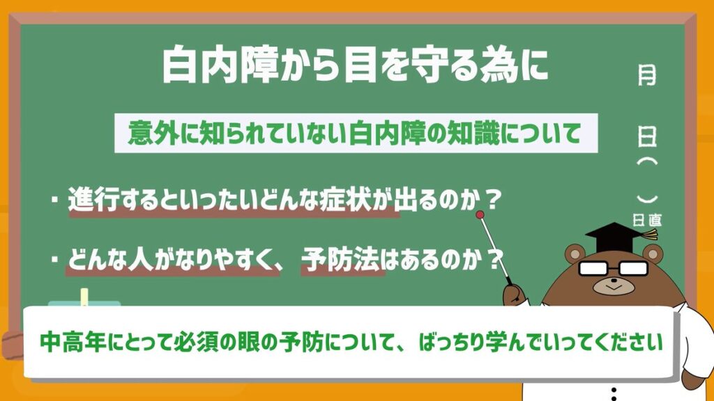 中高年にとって必須の眼の予防について、ばっちり学んでいってください。