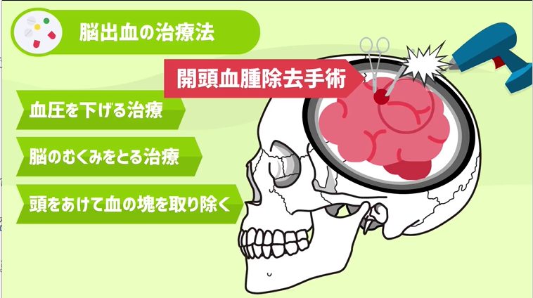 また出血から時間が経っていて、出血量がかなり多い場合は、血腫、すなわち血の塊をとってあげて脳の神経の圧迫を解除してあげなければならないので、頭をあけて血の塊を取り除く緊急手術が行われる場合もあります。