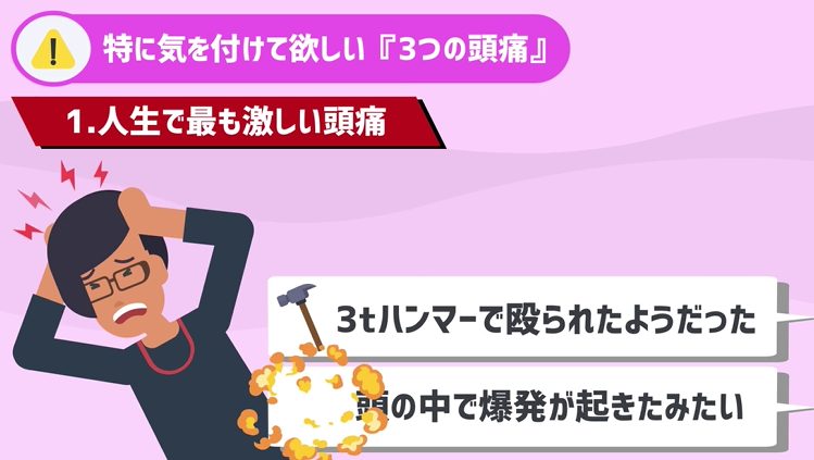 まず一つ目が、「人生で最も激しい頭痛」です。