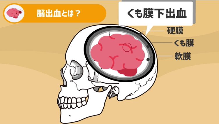 この真ん中の膜であるくも膜の下で動脈瘤が破裂したりして、くも膜の下で出血が広がっていくのが有名な「クモ膜下出血」なんです。
