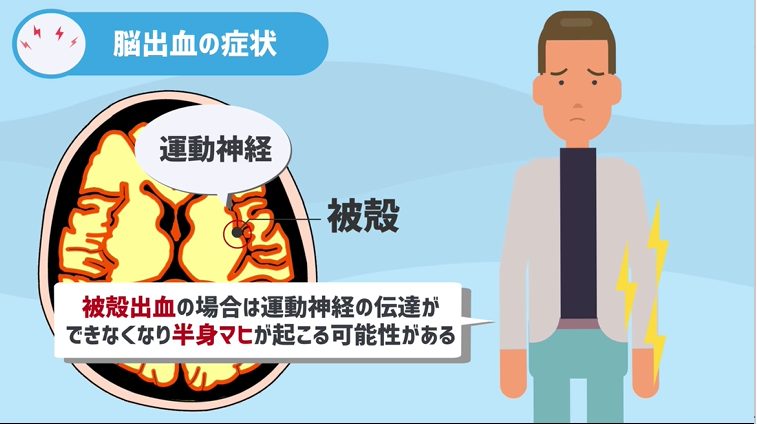 例えば脳の被殻という場所で出血した場合、この被殻は運動神経、すなわち体を動かす神経の通り道なので、この通り道が血腫によってさえぎられ、そのせいで被殻出血の場合は運動神経の伝達ができなくなり半身まひが起こる事があります。