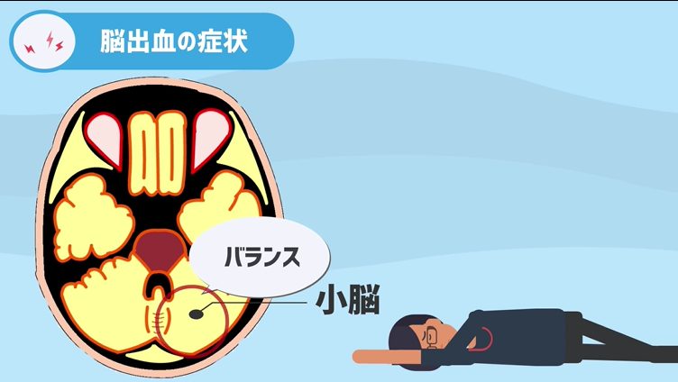 他にも小脳という場所は体のバランスをコントロールしている場所なので、小脳出血が起きると体のバランスがとれなくなり、めまいがしたり、立っていられなくなる事があります。