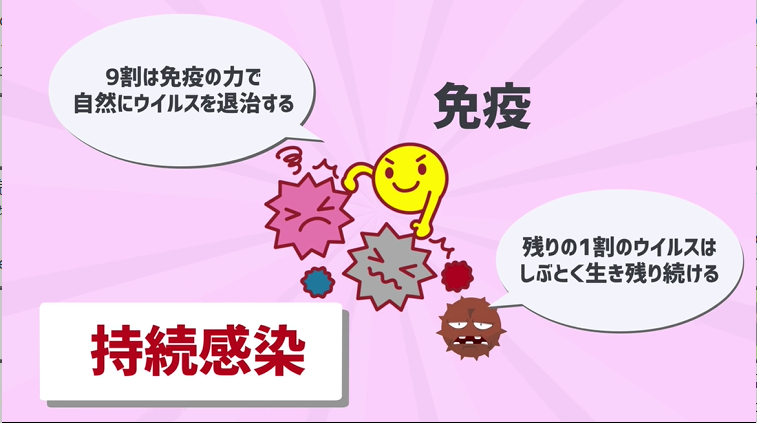およそ9割は自分の免疫の力で自然にウイルスを退治するんですが、残りの1割のウイルスはしぶとく生き残り続けます。この状態を医学用語で「持続感染」といい、持続感染が続くと先ほど説明した異形成、また進行するとがんの状態になってしまうんです。
