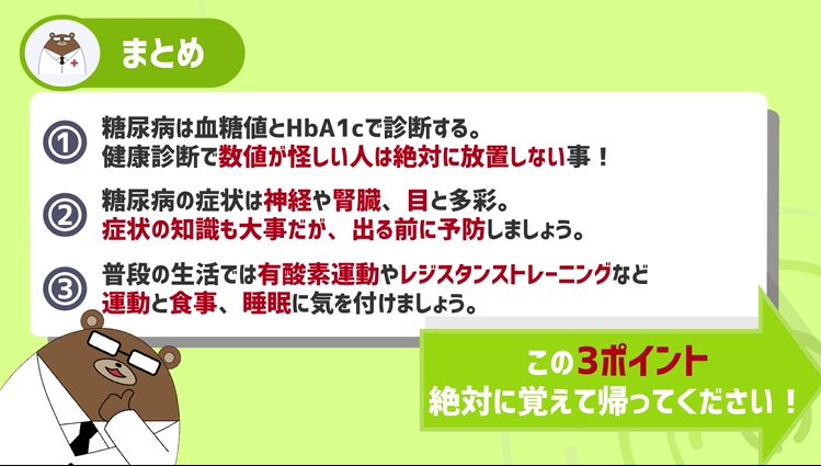②糖尿病の症状は神経や腎臓、目と多彩。最悪足の切断や失明といった恐ろしい結果もある。症状の知識も大事だが、出る前に予防しましょう。