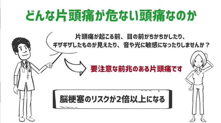 前兆を伴うのも片頭痛の大きな特徴であり、前兆がある場合は脳梗塞のリスクが上昇する、というデータもあり、特にしっかりと通院しておいた方が良い病気になります。