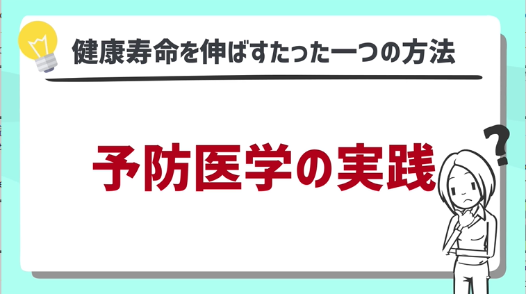 まず、結論から申し上げますと、健康寿命を伸ばすたった一つの方法は「予防医学・予防医療の実践」です。