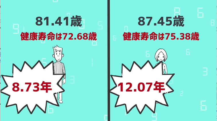 ・日本人の女性の平均寿命が87.45歳なのに対し、健康寿命は75.38歳。