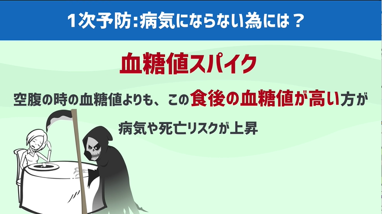 この事を血糖値スパイク、と呼ぶのですが、なんと健康診断で測定する空腹の時の血糖値よりも、この食後の血糖値が高い方が、病気や死亡リスクが上昇した、というデータがあるんです。
