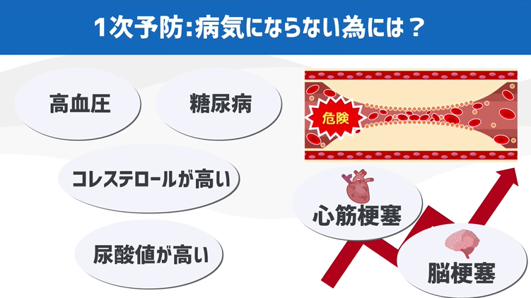 こういった生活習慣病を放置していると、動脈硬化が進行し、掛け合わせで心筋梗塞や脳梗塞のリスクがどんどん上がっていってしまいます。