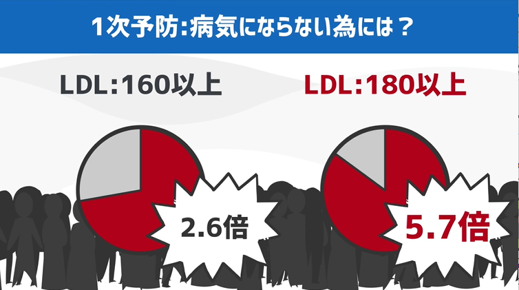 47,000人のコレステロールが高い日本人を集めてリスクを評価したある研究では、LDLは160を超えると心臓病のリスクが2.6倍に、180を超えると5.7倍になった、というデータがあります。