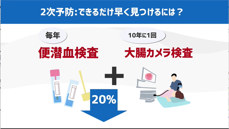 例えば大腸がんであれば毎年の便潜血検査を行い、プラスで10年に1回の大腸カメラの検査、こちらが推奨されていますし、実際に便潜血は大腸がんの死亡率が20%も低下した、という論文も存在します。