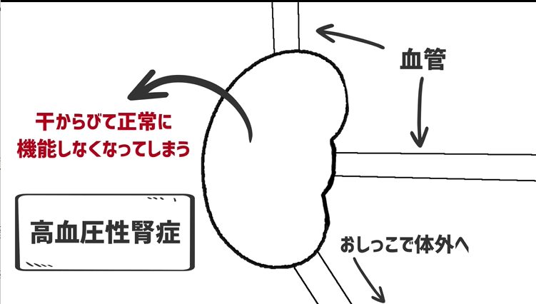 こうして腎臓の機能が落ちてしまい、上手に老廃物を体の外に出せなくなってしまう状態を医学用語で「高血圧性腎症」や「腎硬化症」と呼びます。