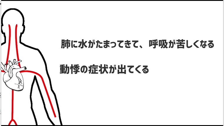 心臓の機能が落ちてくると血液が上手く送れなくなり、肺に水がたまってきて、呼吸が苦しくなったり、動悸の症状が出てくるんです。