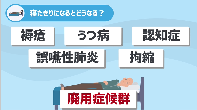 寝たきりやその手前の状態になり、体が自分の思い通りに動けなくなる事自体が認知症のリスクにもつながりますし、体を使わないと筋肉がどんどん衰えたり、寝返りが打てない事で体のあちこちに床ずれができてしまう、こんな事弊害もあるんですね。