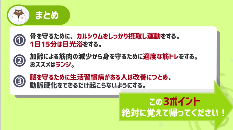 ①骨を守るために、カルシウムをしっかり摂取し運動をする。1日15分は日光浴をする。