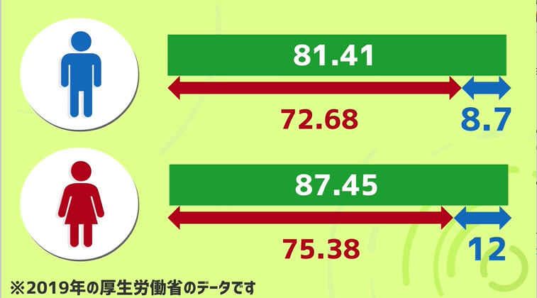 日本では男性の平均寿命は81.41歳なのに対し健康寿命は72.68。女性の平均寿命は87.45歳なのに対し健康寿命は75.38歳という結果になっています。